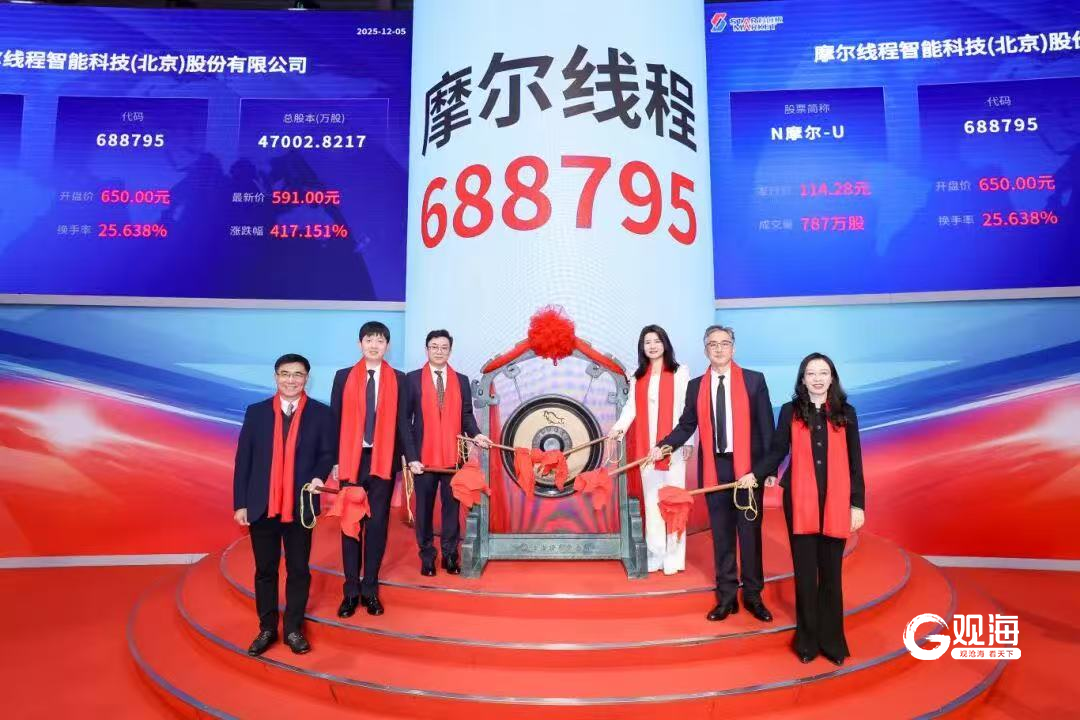 青岛日报社/观海新闻12月6日讯 12月5日,国内GPU领军企业摩尔线程智能科技(北京)股份有限公司(688795.SH,简称“摩尔线程”)正式登陆科创板,开盘价650元/股,暴涨468.78%,市值瞬间突破3000亿元,成为名副其实的“国产GPU第一股”。