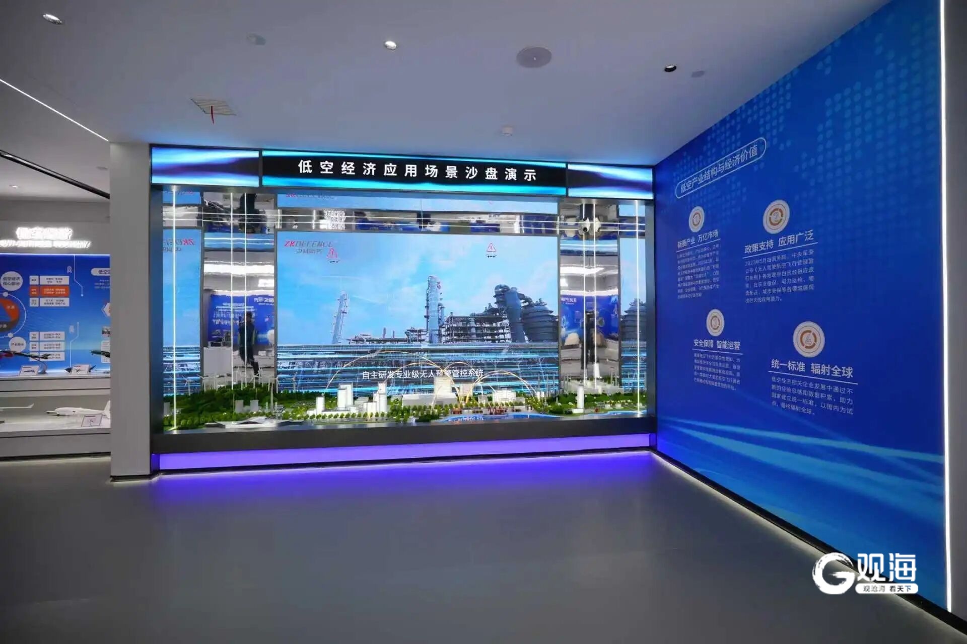 在典型场景沙盘演示区,炼油厂、机场净空区等关键场景的防护流程被生动还原。参观者可直观看到系统如何协同运作,从发现“不速之客”到完成精准处置,整个防御反应过程清晰可见,极具现场感。